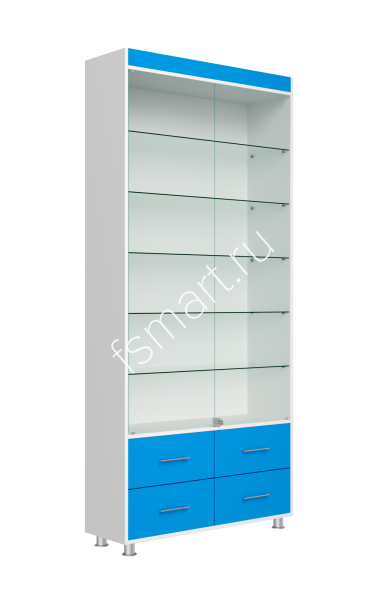 Витрина для торгового зала аптеки с закрытой выкладкой. В нижней части витрины расположены четыре выдвижных ящика-накопителя.