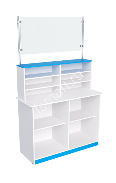 Рабочее место аптечного фармацевта со стеклянным защитным экраном от вирусов. Высота столешницы 1400 мм, общая высота с защитным стеклом 2000 мм.