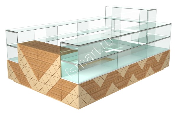 Торговый островок с элементами популярного сейчас стиля "Сканди". "Сканди" - это стиль гармонично сочетающий национальные традиции северных стран и международные тенденции дизайна, натуральные материалы (или, как в этом островке, их имитация), нейтральная цветовая гамма и четкие линии. Такой стиль станет отличным фоном для любого вашего товара. Использовано прозрачное стекло с полированной кромкой. Все используемые материалы соответствуют пожарным требованиям и имеют пожарные сертификаты. Для накрытия в ночное время торговое оборудование может быть укомплектовано чехлом из плотной ткани расцветки RAL 7001.