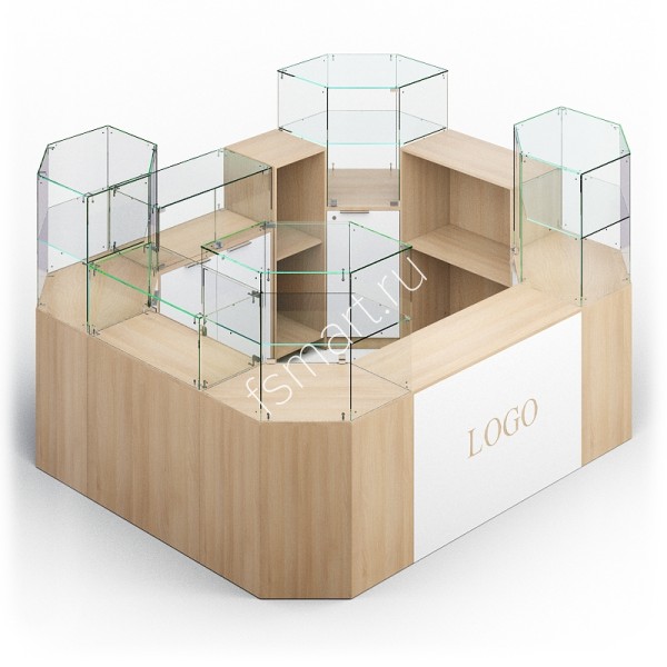 Особенность конструкции состоит в том, что этот торговый остров - модульный, то есть собран из нескольких витрин, соединенных между собой. Это будет полезно, если вы соберетесь перенести торговое оборудование, например, в другой ТЦ.
