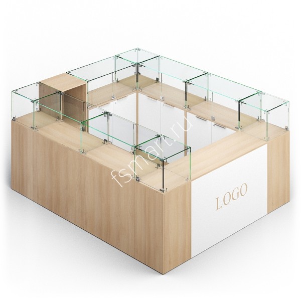 Островные витрины нижнего ценового сегмента. Недорогие материалы, простые конструктивные решения. Качественное ДСП вместо крашенного МДФ, стекла на металлических соединениях вместо клееных соединений. Все сделано для того, чтобы вписаться в адекватный бюджет.