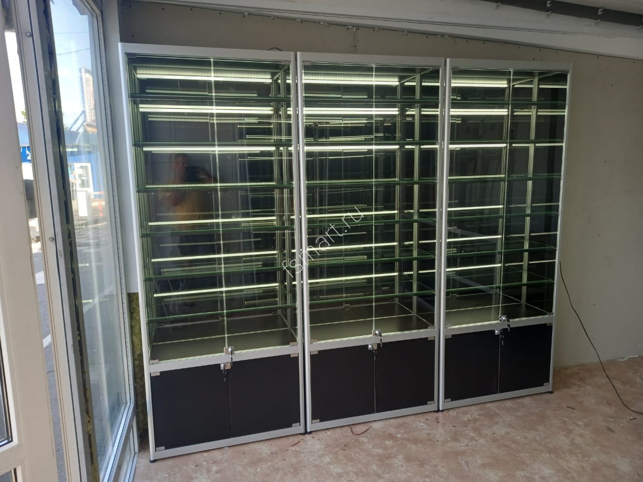 Стеклянная торговая витрина с уже сделанной подготовкой для установки светодиодной ленты на каждую полку. Вам остается заказать у нас саму ленту, выбрав ее тип и цветовую температуру.
