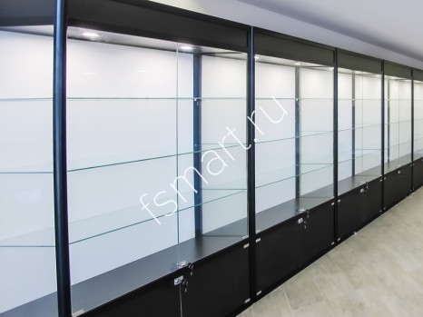 Основа витрины — анодированный алюминиевый профиль, который не деформируется даже при длительной эксплуатации. Боковые и задняя панели изготовлены из влагостойких МДФ-плит толщиной 4–5 мм. Базовая комплектация включает три стеклянные полки толщиной 6 мм. Расстояние между полками - 330 мм. Расстояние можно самостоятельно изменять в зависимости от ваших потребностей, переставляя полкодержатели.