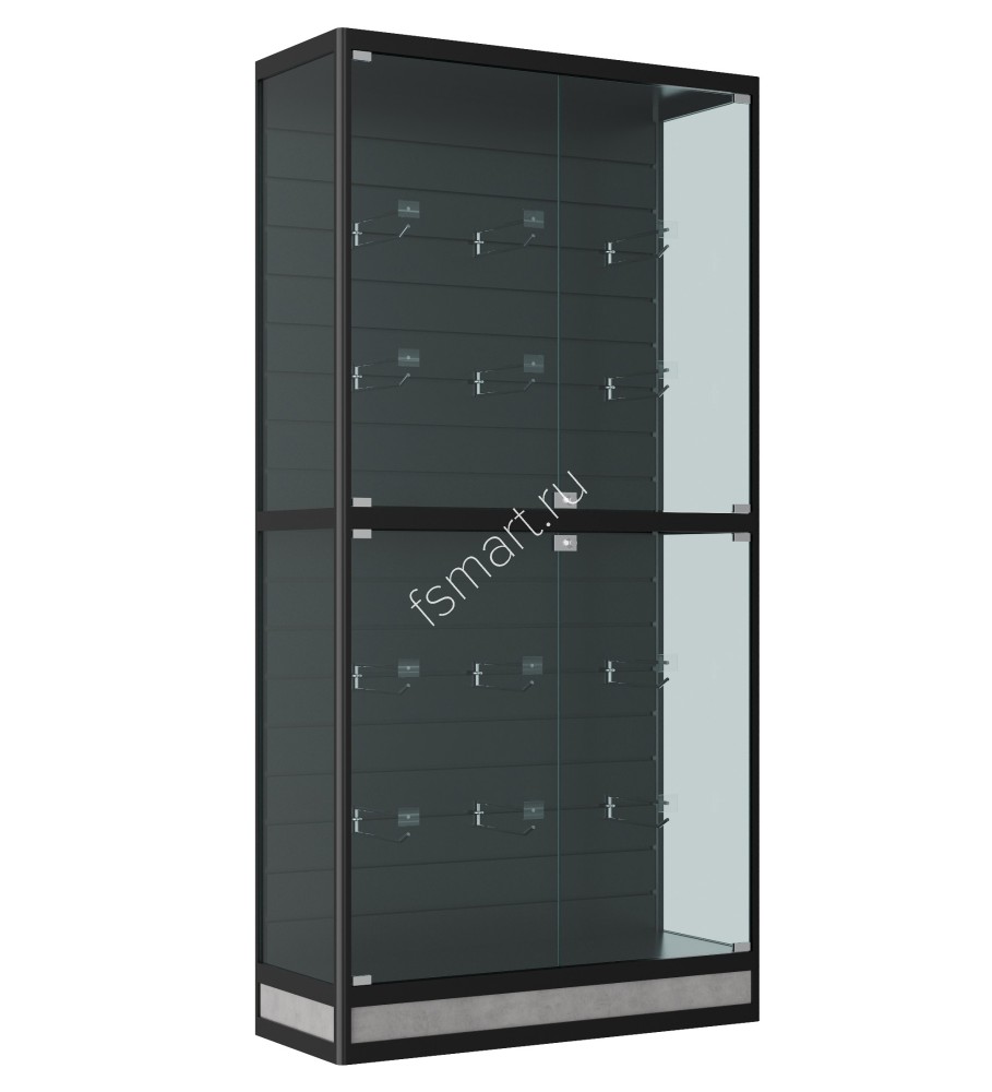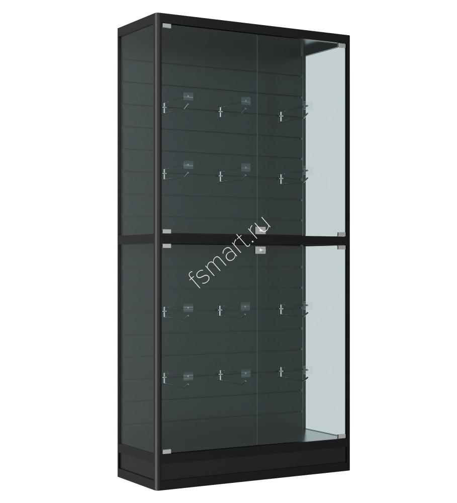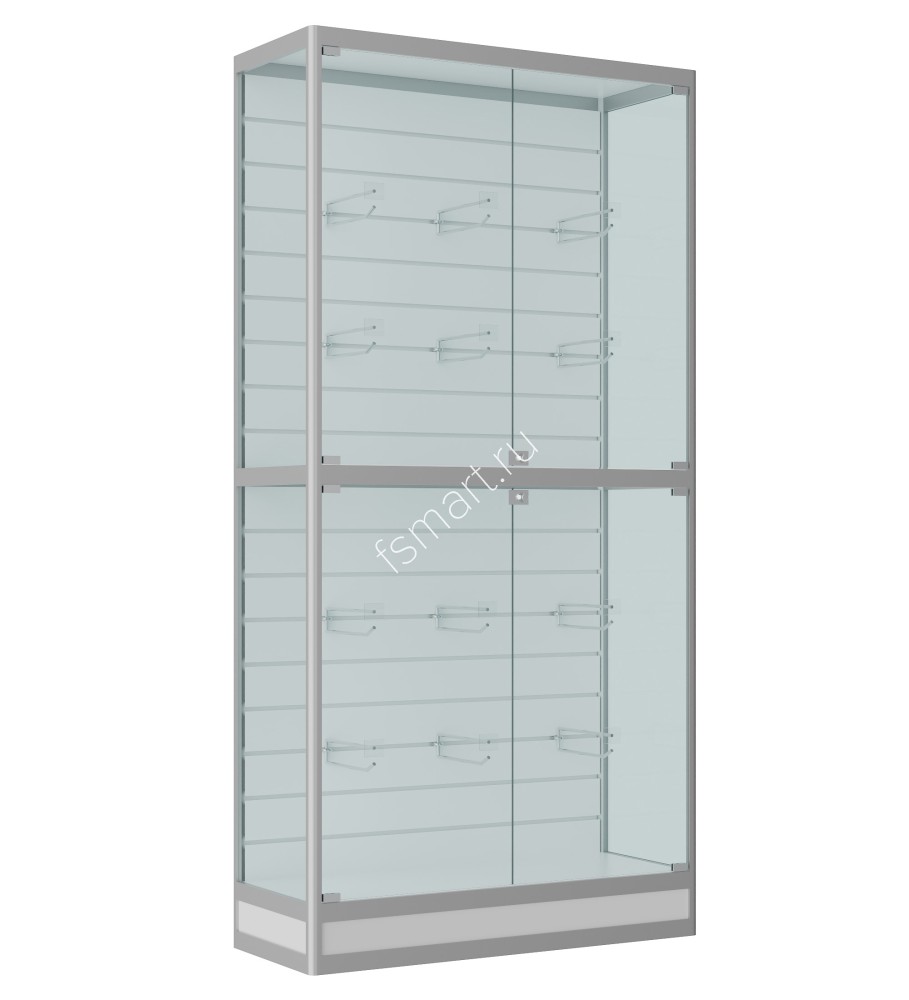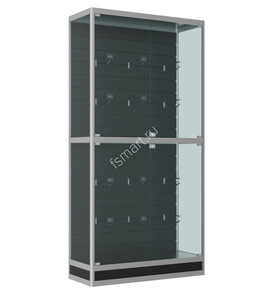 В базовой комплектации витрины сделана подготовка под подсветку светодиодной лентой по периметру остекления. Верхняя и нижняя части алюминиевой витрины имеют отдельные пары дверей из стекла 5 мм. Дверцы подвешены на стальных петлях с замками марки Soller из цинкового сплава с покрытием хром.