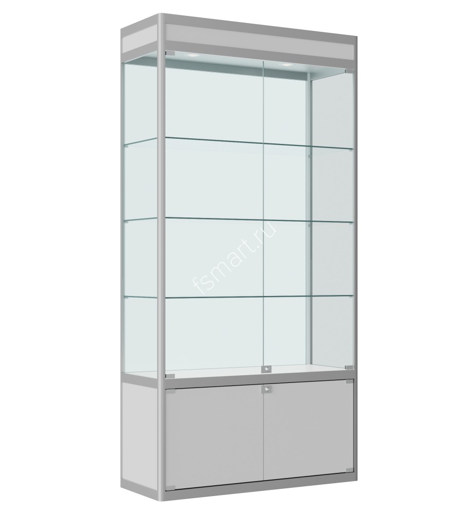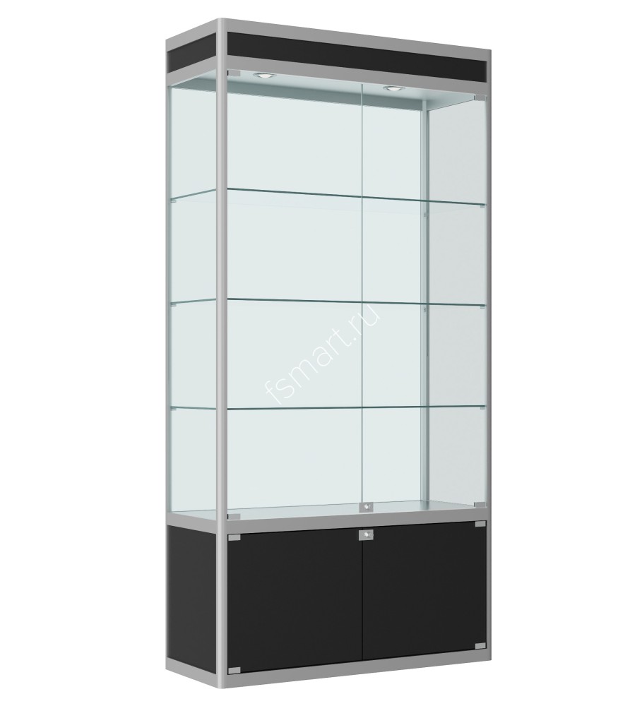 На дверцы и накопитель установлены надежные замки Soller из цинкового сплава с хромированным покрытием. Подсветка - два светодиодных светильника mr16 9W нейтральной цветовой температуры. Высота рекламного поля в верхней части витрины - 70 мм.