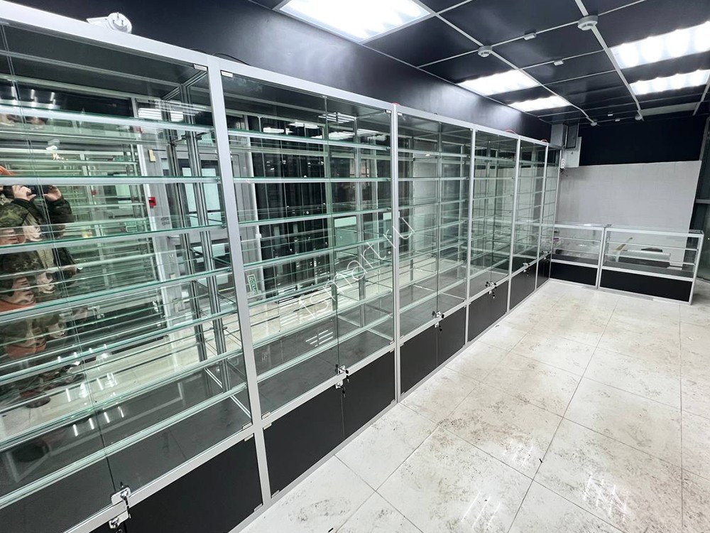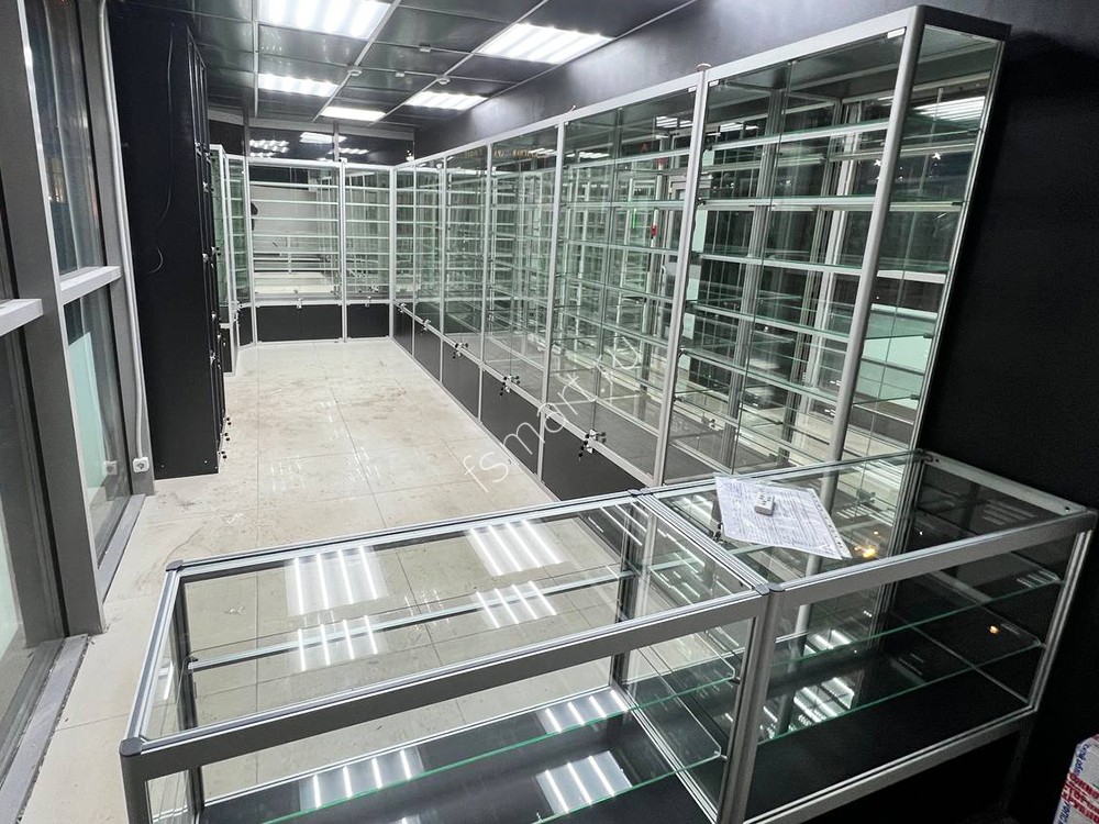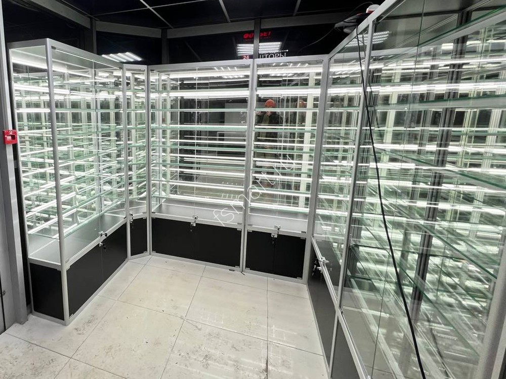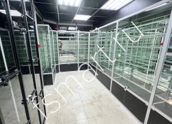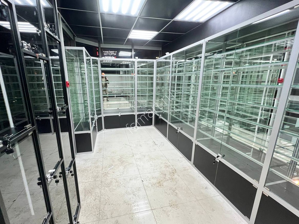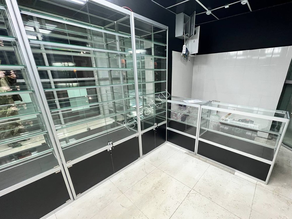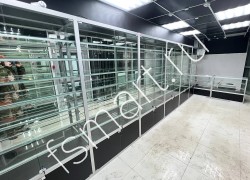 Витрины изготовлены из алюминиевого профиля, стекла и ДСП. Оснащены семью ярусами стеклянных полок. Имеют вместительные накопители. Распашные дверцы витрин оборудованы замками. Установлена светодиодная подсветка полок.